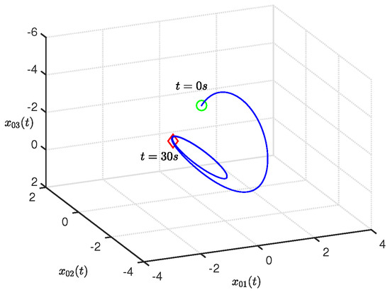 The initial gains , , and in the adaptive law (10) should be selected according to the following considerations. Firstly, to ensure positive definiteness, all initial values must be strictly positive (e.g., ) so that the adaptive law starts with a reasonable update direction. Secondly, the values can be empirically chosen based on the system’s dynamic range. For instance, if the upper bound of external disturbances χ or the Lipschitz constant of the nonlinear term is known, one may set and . In the absence of prior knowledge, a uniform small positive constant (e.g., ) is recommended. Finally, while the initial values influence the transient adaptation speed, they do not affect the system’s asymptotic convergence or stability, as the adaptive law dynamically tunes the parameters to their steady-state values.