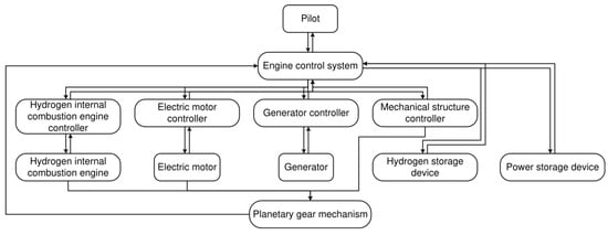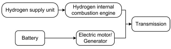 The hybrid power system of electric motors and hydrogen internal combustion engines has three structural forms, namely series, parallel, and series–parallel configurations []. Different hybrid power combination modes offer varying levels of power [] and have different spatial and weight requirements, necessitating the selection of a suitable structure for hydrogen internal combustion engine–electric hybrid engines. The basic structures of the hybrid power systems are outlined below.