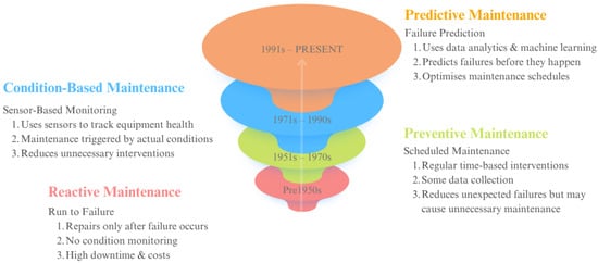 As a fundamental aspect of the industrial sector, maintenance plays a crucial role in production costs, making well-structured strategies essential to minimise unplanned downtime, reduce expenses, and extend the lifespan of industrial machinery []. As illustrated in Figure 1, the evolution of maintenance strategies has transitioned from reactive approaches, where failures were addressed only after their occurrence, to preventive methods based on scheduled interventions []. With the advent of sensor technologies and monitoring equipment, this progression led to the adoption of condition-based maintenance (CBM), where maintenance decisions are guided by actual equipment condition. This is followed by predictive maintenance (PdM), which is widely used today, using the integration of IoT, machine learning, big data, and other advanced technologies to predict equipment failures before they occur [,].