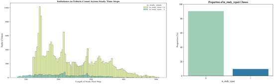 - The “tte” table (training set) and “label” table (validation/test sets) contain repair logs for the trucks. The “label” table includes five labels (0 to 4) corresponding to time windows before failure: more than 48, 48-24, 24-12, 12-6, and 6-0 time steps. The “tte” table features “length_of_study_time_step”, which indicates the number of operational steps since Component X began functioning, and “in_study_repair”, which is set to 1 if a repair occurred at that time step, or 0 if no repair event took place during the study period. Consequently, the information in the “tte” table must be transformed to align with the “label” table. It is also worth mentioning that a significant imbalance is observed in the “in_study_repair” feature, where the majority of the data correspond to time steps with no repair events (i.e., “in_study_repair” = 0), as illustrated in Figure 2.