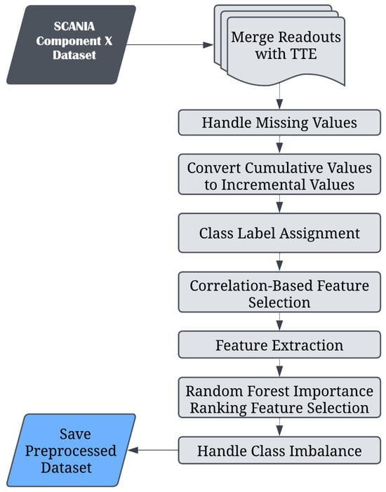 The data preprocessing framework employed in this research is depicted in Figure 3. The initial step involved merging the operational readout data with the corresponding tte data, facilitating subsequent class label conversion. Following this merge, missing values within the datasets were addressed. Initially, linear interpolation was employed to estimate missing values using adjacent data points within each vehicle’s time series. Where gaps persisted post-interpolation, forward filling was utilised to propagate existing data points forward in time.