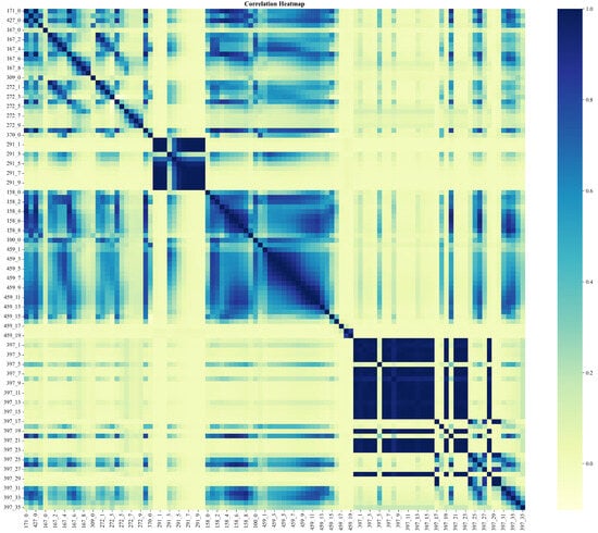 In considering that the original dataset contained 105 features, an analysis of the correlation heatmap, Figure 4, revealed distinct clusters of highly correlated variables, enabling the removal of redundant information. Variables exhibiting correlation coefficients exceeding a threshold of 0.9 were consequently excluded. This procedure reduced the feature dimensionality substantially, yielding a refined dataset comprising 51 unique variables. Given that the initial data were structured as sequential multivariate time series, a transformation into a structured tabular format was essential to facilitate predictive analysis through machine learning algorithms. To achieve this transformation, the tsfresh library was utilised to perform feature extraction via a sliding window approach. Specifically, windows of lengths 4, 8, 16, 32, and 48 time steps were selected to evaluate the influence of temporal resolution on predictive performance. The algorithm implemented for window creation is detailed as follows: