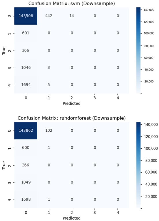 RQ1: To what extent can machine learning models accurately predict failures of Component X in a cost-sensitive setting? The predictive results indicate that failures of Component X can be detected with reasonable accuracy using classical machine learning models, particularly under a cost-aware and class-imbalanced setting. When trained using the downsampling strategy, SVM and RF achieved the highest test accuracy (0.97) and competitive macro F1-scores (0.20), outperforming other models in both predictive accuracy and cost-efficiency. However, confusion matrix analysis, Figure 5, reveals a critical limitation of these models: despite overall high accuracy, both RF and SVM exhibit poor recall for minority classes (i.e., failure classes 1–4). This reflects a common problem in class-imbalanced settings, where models tend to prioritise the dominant class (Class 0) to optimise global accuracy [], often at the expense of minority class detection. For example, the RF model predicted nearly all samples as Class 0, correctly classifying only two minority-class instances out of over 3700. This suggests persistent class imbalance issues or model bias toward the dominant class, contributing to low macro F1-scores. This could be addressed with loss reweighting to prioritize minority classes, focal loss to focus on hard-to-classify samples, or temporal deep learning models like Long Short-Term Memory (LSTM) networks to better capture time-series dependencies.