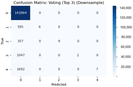 To address this, an ensemble model was proposed using a hard-voting classifier that combined the top three performing models under the downsampling strategy: SVM, RF, and XGBoost. As shown in Figure 6, the voting classifier exhibited improved minority class coverage, correctly identifying several instances in each failure class (e.g., 6 in Class 1, 9 in Class 2, and 7 in Class 4). Although the improvements in macro F1-score (0.21) and accuracy (0.98) appear modest, the voting classifier delivered the lowest total misclassification cost (41,600) and lowest average cost per vehicle (8.37)—outperforming even the individual RF model.