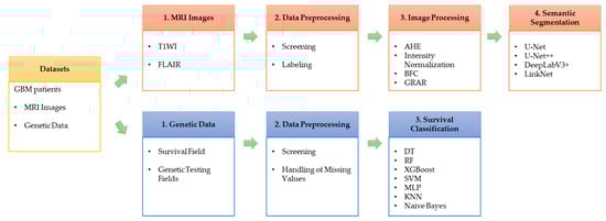 The hospital provides data of GBM patients, including MRI and genetic data. The MRI data is filtered and annotated to form the raw dataset, which then undergoes four image processing techniques: AHE, intensity normalization, BFC, and GRAR. Each technique generates a corresponding dataset. The datasets are then subjected to image segmentation using four semantic segmentation models: U-Net, U-Net++, DeepLabV3+, and LinkNet.