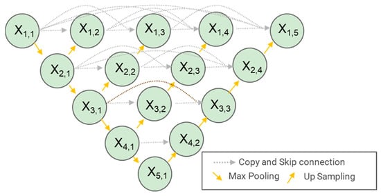 In the related literature, Cui et al. [] applied U-Net++ [] for brain tumor segmentation in CT images. Wu et al. [] used U-Net++ for the automatic segmentation of pelvic organs after hysterectomy, while Micallef, Seychell, and others [] utilized U-Net++ for automated brain tumor image segmentation. These studies show that U-Net++ is an effective model for segmenting brain tumor MRI images.