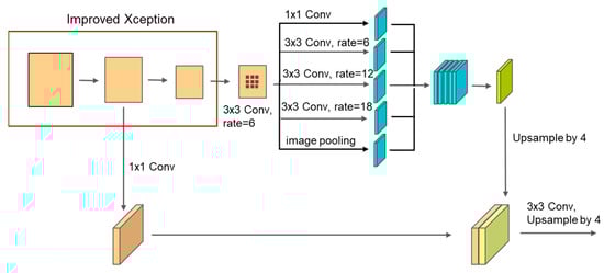 - Chen, L.C.; Zhu, Y.; Papandreou, G.; Schroff, F.; Adam, H. Encoder-decoder with atrous separable convolution for semantic image segmentation. In Proceedings of the European Conference on Computer Vision (ECCV), Munich, Germany, 8–14 September 2018; pp. 801–818. [Google Scholar]