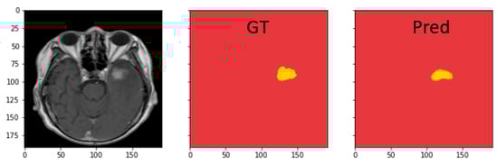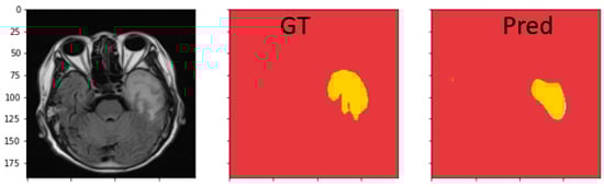In the FLAIR image sequence, the highest accuracy was achieved by the U-Net model using the GRAR technique, with a Dice coefficient of 0.801. Similarly, the average performance of the U-Net model with FLAIR images was better than other methods, suggesting that U-Net is the more suitable model for training when FLAIR sequences are used. The semantic segmentation result of one FLAIR image sequence using the U-Net model is shown in Figure 9.