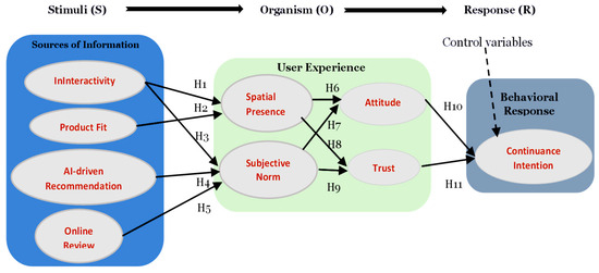 This study applies a stimulus–organism–response (SOR) paradigm as a fundamental framework to understand how AR mobile platforms influence continuance intention. Previous studies have followed the framework to examine immersive experience, repurchase intention, and continuance intention [4,27]. This model is embedded in environmental psychology, which utilizes stimuli cues to explain cognitive reactions. The user’s cognitive state is influenced by multiple stimuli cues in an environment that consequently affects their behavioural responses [26]. According to Mehrabian and Russell’s theory, stimulus components are described as an environment’s spatial, temporal, or sensual characteristics. Several studies have applied this framework to identify users’ behavioural responses by assessing user experience and their impacts on continuance intention [5,34]. In a recent study on AR mobile platforms, visual, acoustic, and haptic stimuli factors are described as stimuli cues, while arousal and pleasure are described as emotional states and subsequently relate to users’ behavioural responses [27]. Furthermore, Barta applied the SOR paradigm to extend research on how AR influences decision-making by reducing cognitive dissonance and assessing users’ shopping experiences [28].