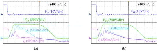 Figure 7 and Figure 8 show the current distribution when SiC MOSFETs with different BVs are connected in parallel. Figure 7a or Figure 8a show the avalanche current sharing when two and three SiC MOSFETs are connected in parallel under low-current conditions, respectively. Figure 7b and Figure 8b show the avalanche current sharing when two and three SiC MOSFETs are connected in parallel under high-current conditions, respectively. It can be seen that the devices have uneven current sharing due to inconsistent BVs, and the current sharing may also change under different total currents. This confirms the difference in hardness of the blocking characteristic curve described in Figure 2.