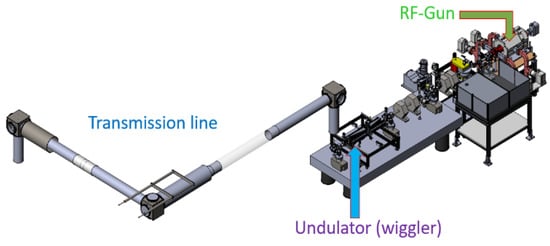 The THz-FEL source is driven by a photo-injector RF LINAC gun that produces femtosecond-scale electron bunches. This RF LINAC employs a hybrid structure composed of both standing-wave and traveling-wave sections, yielding broadband electron beams with controlled energy chirps. THz radiation is emitted from a 12 × 6 mm flat aperture, the output of the waveguide (undulator/wiggler), with a spectral bandwidth of approximately 10% around the central resonance frequency. The system offers tunability in the 1–3.5 THz range, with the resulting EM field energy distributed across three distinct waveguide modes [17]. The modal structure in the frequency domain is derived from a space–frequency formulation of ultrawideband interactions in free-electron lasers [18], and it incorporates enhancements from coherent spontaneous emission FELs and prebatched FEL configurations that employ periodically modulated short electron beam pulses [17]. The general layout of the THz FEL is depicted in Figure 1.