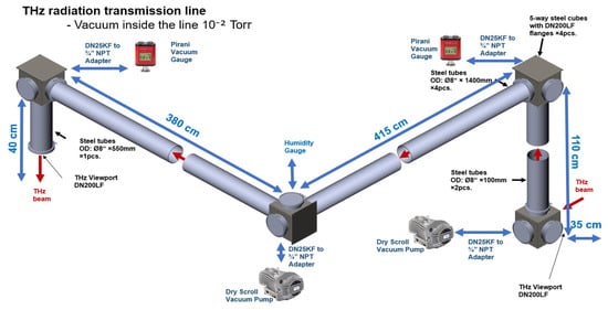 - Horowits, O.; Gerasimov, M.; Lurie, Y.; Friedman, A. Study of the transmission line for Israeli THz free-electron radiation source. Phys. Plasmas 2022, 29, 113301. [Google Scholar] [CrossRef]