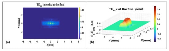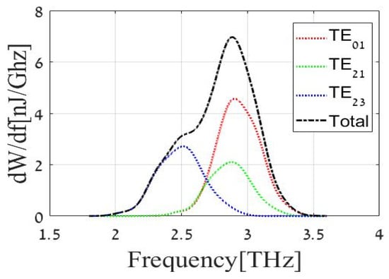 The algorithm is capable of simulating any TEmn or TMmn mode. However, this study focuses on three dominant modes in the FEL system: TE01x, TE21x, and TE23x (as illustrated in Figure 3). These modes contribute significantly to the total energy—approximately 33% for TE01, 22% for TE21, and 30% for TE23 [37]—as also depicted in Figure 3.