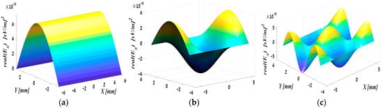 where Dx, Dy is a slot size. According to Equation (27), one can see a “sinc behavior” of the . The greater the length of the slot parameter (Dx, Dy) causes greater decay in this particular axis. Fourier transform of rectangular field apertures and highlighted that this serves as a first-order approximation consistent with the field structure in the TE01 mode.