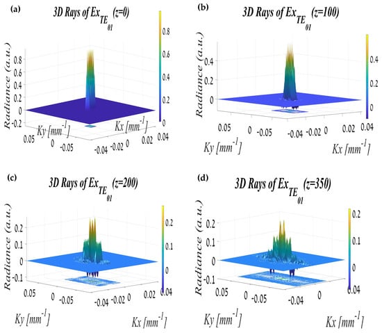 The TE01 mode propagation in terms of the rays: (a) at the out of the waveguide, (b) after passing 100 mm, (c) after passing 200 mm, and (d) after passing 350 mm.