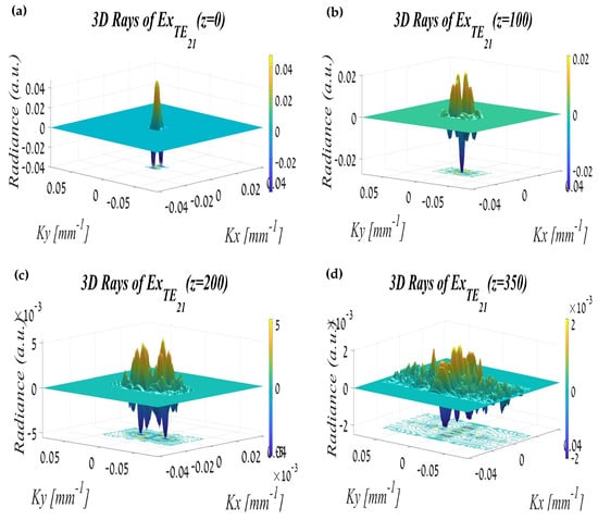 The TE21 mode propagation in terms of the rays: (a) at the out of the waveguide, (b) after passing 100 mm, (c) after passing 200 mm, and (d) after passing 350 mm.