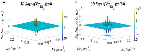 In all three modes, the beam diameter at the optical path’s exit is approximately one-third of its initial diameter (i.e., reduced from 12 mm to ~4 mm). It should be emphasized that the intensity values have been normalized to the initial peak intensity. Consequently, in the TE01 and TE21 modes, the peak intensity is approximately 1.3 times higher than the initial maximum, reflecting enhanced focusing. In contrast, the TE23 mode reaches only about 70% of its initial peak, a result attributed to the substantial divergence of this mode. Specifically, while 2500 rays were initially launched from each XY coordinate, the most focused pixel at the end of the optical path collected only 1188 rays—demonstrating the broader spatial dispersion of TE23.