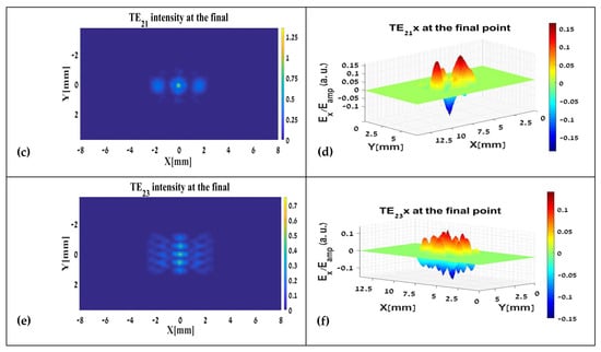 Figure 8b,d,f present the results at the end of the TL. In other words, they illustrate the expected field distribution at the user end—on the experimental table of the THz-FEL system. The spatial profiles bear some resemblance to their respective sources, particularly in the TE01 and TE21 modes. Notably, the reconstructed field distributions appear more tightly focused. However, for a direct comparison with the analytical Gaussian beam calculations, we refer to the intensity distributions shown in Figure 8a,c,e.