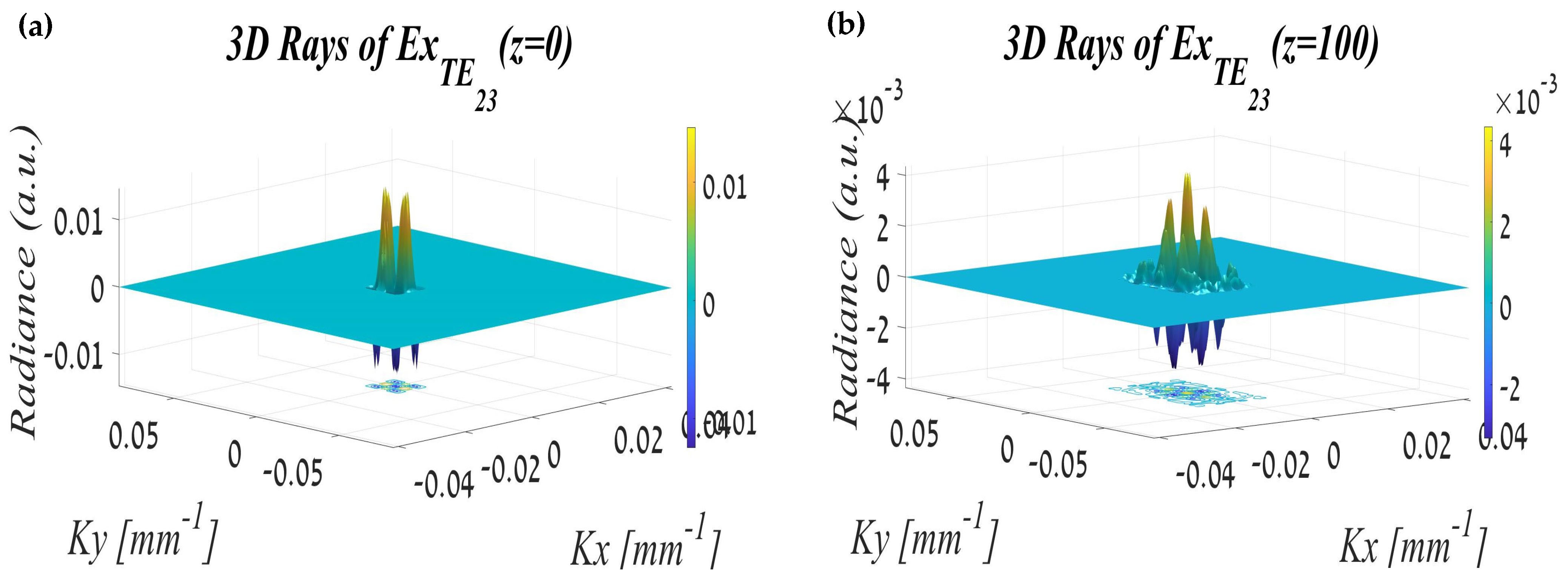 - Wavelength Independence: While the TL was modeled under the paraxial approximation (using ABCD matrices), the approach remains largely wavelength-independent for small-angle rays. High-angle rays, more sensitive to wavelength, contribute less to the overall field due to their lower intensity in the WDF framework.