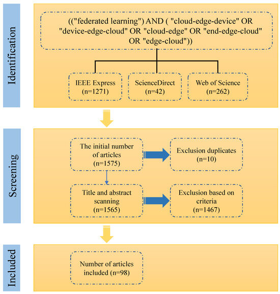The review’s temporal scope spans from 2021 to January 2025, which was deliberately selected to capture the latest advances in federated learning architectures, particularly in light of the widespread adoption of cloud–edge–end paradigms and the integration of privacy-preserving mechanisms such as differential privacy, secure aggregation, and the blockchain. However, we acknowledge that this temporal delimitation may exclude influential foundational works published prior to 2021. While our review prioritizes recent developments that reflect the current state and trends of the field, earlier contributions—especially those from 2017 to 2020—played a crucial role in shaping the trajectory of FL. As such, this scope constitutes a limitation of the present study, and we encourage readers to consult complementary reviews covering earlier periods for historical grounding. The search in both databases employed a specific set of keywords: ((“federated learning”) AND (“cloud–edge–device” OR “device–edge–cloud” OR “cloud–edge” OR “end–edge–cloud” OR “edge–cloud”)).
