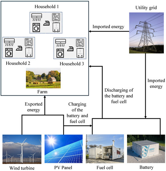 Schematic overview of the microgrid architecture supplying a farm and three households.
