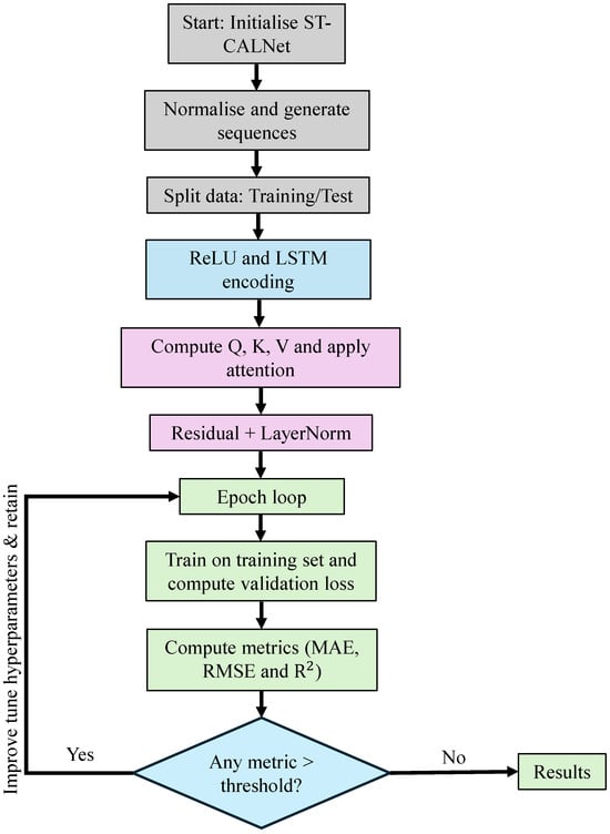 Figure 2 presents a comprehensive flowchart outlining the operational pipeline of the proposed ST-CALNet model. The workflow commences with the initialisation of model parameters, including the sequence length, early stopping criteria, and training configurations. This is followed by a preprocessing phase, where multivariate input data—comprising electricity consumption, solar PV generation, and wind power—is normalised using min-max scaling. Subsequently, sliding-window sequences are generated to capture temporal dependencies, and the data is divided into training and test sets.