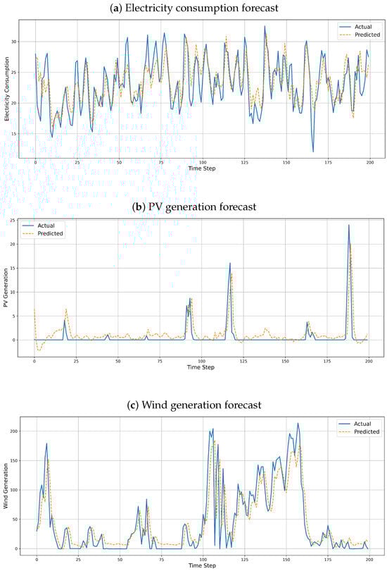 The forecasting performance of the proposed ST-CALNet model was evaluated across three key indicators in a renewable-integrated smart grid environment: electricity consumption, PV generation, and wind generation. Figure 3 illustrates the model’s predictive accuracy through comparative plots of actual versus predicted values over a 200-time-step interval.