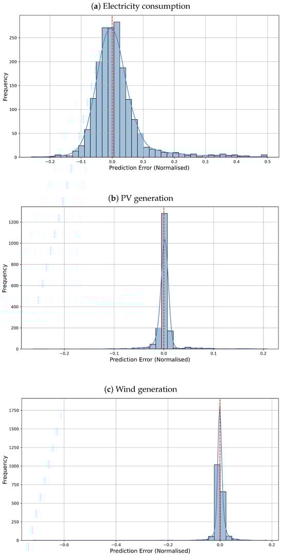 ST-CALNet outperforms traditional and DL baselines, including naïve methods, Linear Regression, and vanilla LSTM models. Although the improvements in (0.4867) were marginal compared to Linear Regression (0.5195), ST-CALNet achieved the lowest MAE and MAPE scores, suggesting a more balanced and reliable performance. Moreover, error distribution histograms confirmed that the model errors were symmetrically centred around zero with a limited number of outliers, particularly for PV and wind forecasts, reflecting strong generalisation capabilities across variable regimes.