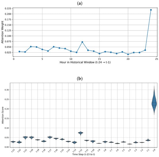 To provide a broader perspective, Figure 6b presents the aggregated distribution of attention scores across all prediction sequences using violin plots. The most prominent concentration again occurs at the final time step (t–1), reaffirming the model’s consistent focus on recent historical data. Secondary peaks around t–13 and t–21 may reflect latent periodicities such as daily consumption cycles or delayed weather-related effects.