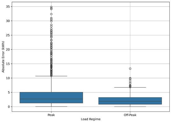Figure 7 compares absolute forecasting errors during peak and off-peak periods. The median error during off-peak hours is visibly lower than that during peak periods. This disparity reflects the higher volatility and load unpredictability associated with peak demand times, making accurate forecasting more challenging. The interquartile range is also wider for peak periods, suggesting more variability in prediction outcomes.