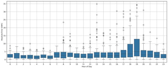 Figure 8 presents the hourly distribution of forecasting errors. Errors are generally stable and low during the early morning hours but tend to increase significantly in the late afternoon and early evening, particularly between 17:00 and 20:00. These hours typically correspond to high demand variability due to residential usage surges, aligning with earlier findings in Figure 7.