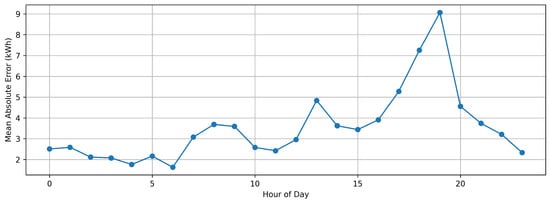 Figure 9 further quantifies this trend by plotting the MAE for each hour. A clear peak appears around 19:00, with the mean error reaching approximately 9 kWh. In contrast, night-time and early-morning hours (e.g., 1:00–6:00) exhibit mean errors below 3 kWh. These insights are vital for system operators implementing demand response strategies during vulnerable time windows.