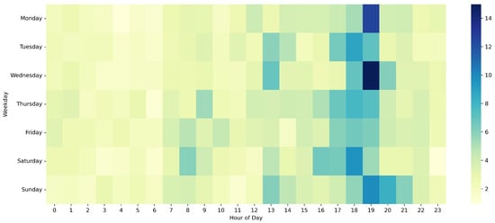 Figure 10 provides a heatmap of absolute forecasting error as a function of weekday and hour. The most prominent error hotspots occur on weekday evenings, particularly on Wednesday and Friday, between 18:00 and 20:00. This suggests that mid-week and end-of-week routines present more complex load profiles, potentially due to hybrid residential and commercial energy demand. Weekend errors remain consistently lower, likely due to more predictable domestic usage patterns.