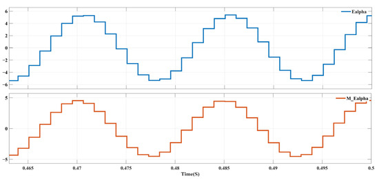 where represents the non-homogeneous solution of the back EMF in the α and β axes from time k to k + 1; is the phase offset indicating the phase relationship between and the ; is the amplitude scaling expressing the amplitude relationship between and the . To visually represent the differences between the two, simulation software was used to simulate and , and the results are shown in Figure 1. In the simulation, an eight-pole SPMSM is adopted. Its parameter A is −500, and the permanent magnet flux linkage is 0.0128 Wb. The sampling period T is set to 1.11 ms, and the electrical angular velocity of the SPMSM is controlled to be maintained at 420. It can be seen from Figure 1 that there are obvious differences between and . At this time, the is −0.2521 rad, and the is 8.4 × 10−4.