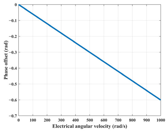 According to Equation (10), it can be seen that when the rotational speed of the motor is higher, that is, when the carrier–frequency ratio decreases, the phase difference between E(k) and is greater. Figure 2 shows the relationship between electrical angular velocity and phase offset when A is −500 and T is 1.11 ms.