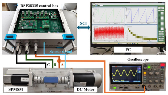 The experimental platform setup is shown in Figure 3. The DSP28335 control box is used to implement the digital control of the motor, and the ALO and TLO are constructed in the DSP, according to Equations (28) and (30). The current of the SPMSM is measured using an ACS711ELCTR Hall sensor, which has a maximum detectable current of 25 A. The actual rotor position is provided by an incremental encoder with a resolution of 2500 PPR, serving as a benchmark for measuring the accuracy of the estimated position. In the control strategy, a PI controller is employed to directly regulate the rotational speed of the SPMSM. The proportional gain is configured to four, while the integral gain is set to eight. The output of the PI controller serves as the reference value for the q-axis voltage , and the reference value for the d-axis voltage is established at 0 V. The inverter adopts the space vector pulse width modulation algorithm to enable the SPMSM to obtain the actual q-axis and d-axis voltages. At the same time, it is highly challenging for the rotational speed of an actual high-speed PMSMs to undergo significant variation within a single sampling period. Nevertheless, the sampling frequency employed in this experiment was 900 Hz, which makes it more probable for the motor’s rotational speed to change considerably within one sampling period. Consequently, even in the no-load experimental setup, a brushed DC motor was connected in the system as a loading device. This was done in order to increase the moment of inertia of the tested SPMSM, thereby mitigating the fluctuation of rotational speed during a single sampling period. Finally, the data generated in the experiment, such as the actual position, estimated position, estimated position error, rotor position compensation, actual speed, estimated speed, a-phase current, and load torque, are sent to a personal computer (PC) by the DSP28335 at a frequency of 1 KHz through the serial communication interface (SCI) for analysis and storage.