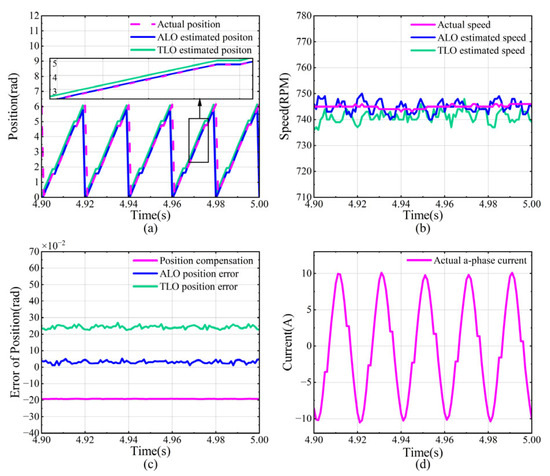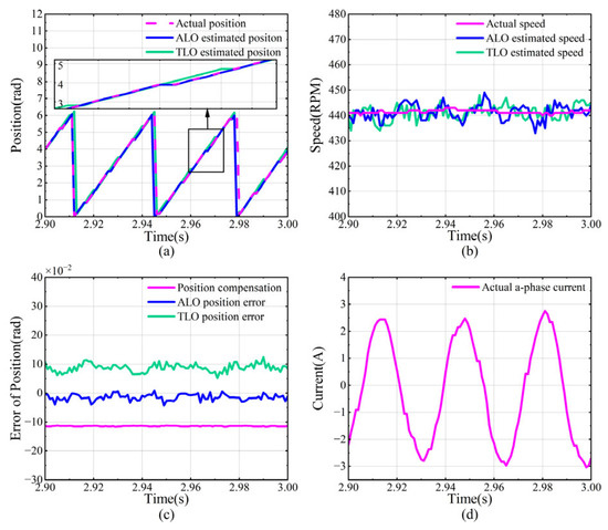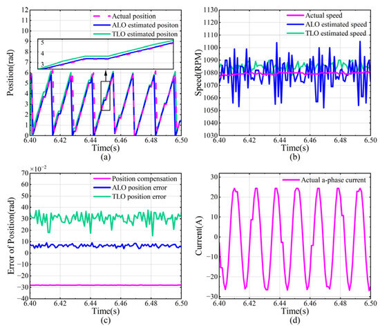 Experimental comparison of ALO and TLO at a CFR of 12.27: (a) actual position vs. ALO and TLO estimated positions; (b) actual speed vs. ALO and TLO estimated speeds; (c) position compensation, ALO and TLO position errors; (d) a-phase current.