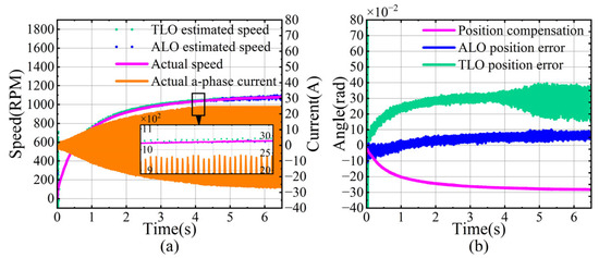Experimental comparison of ALO and TLO at a CFR of 12.27: (a) actual speed, a-phase current, and estimated speed of ALO and TLO; (b) position compensation, ALO and TLO position error.