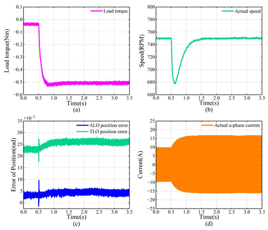 Experimental comparison of ALO and TLO under the condition of sudden change in load torque: (a) load torque; (b) actual speed; (c) ALO and TLO position errors; (d) a-phase current.