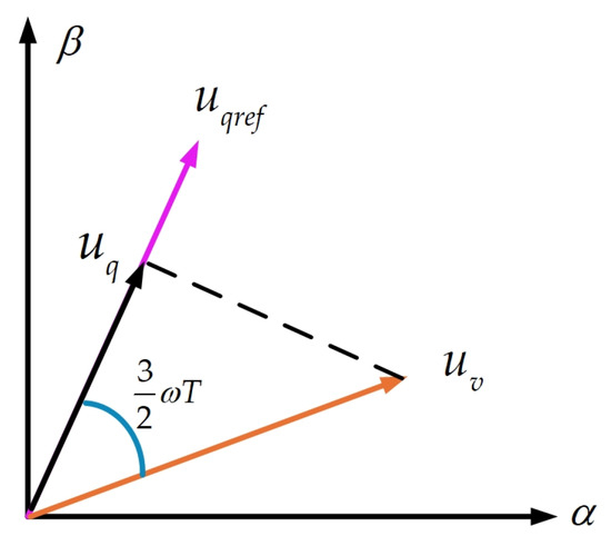 The relationship between the actual voltage vector of the motor and the q-axis reference voltage when the reference value of the d-axis voltage is zero is illustrated in Figure 9. The amplitudes of the two voltage vectors are identical, but there is a phase difference of . Consequently, the relationship between the actual q-axis voltage and the q-axis reference voltage can be described as