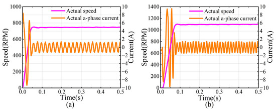 As shown in Figure 10, the current of the motor at both speeds is approximately 1.25 A. Due to the relatively small system delay, the current changes at these two speeds are not obvious. Moreover, under this experimental condition, when the speed reaches 1100 RPM, the is 7 V. According to Equation (35), since: