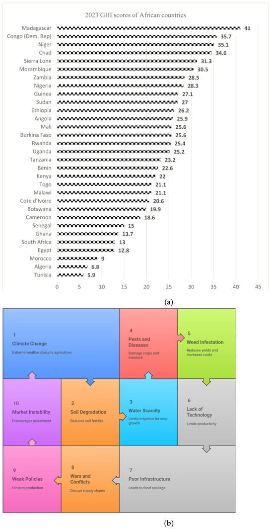 Statistics on Global Food Insecurity and Causal Factors (a) Global Hanger Index (GHI) of African Coutries in 2023 [4] (b) Agricultural Challenges and Interconnectivity.