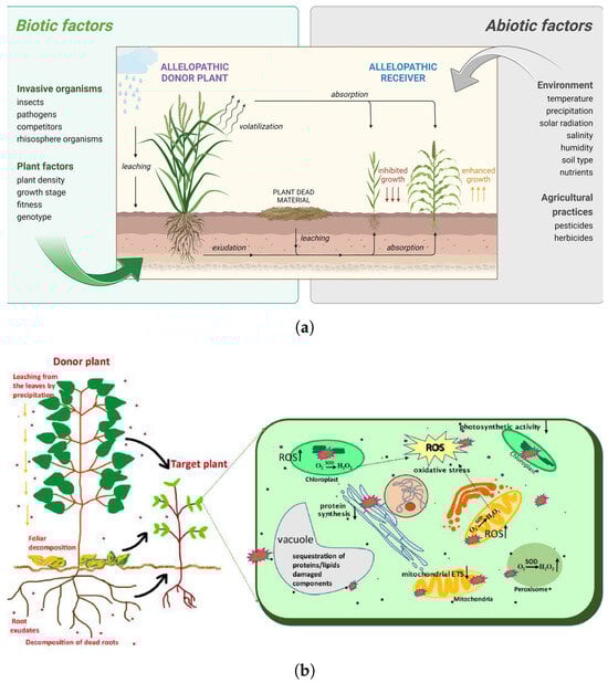 Allelopathy’s mechanism of action. (a) Schematic representation of allelopathic mechanism [10]. (b) Allelochemicals attacking target plant’s cell through production of reactive oxygen species (ROS) [11].