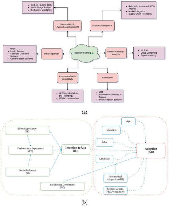 Precision farming. (a) Key components of precision farming. (b) Factors influencing smart farming adoption [13].