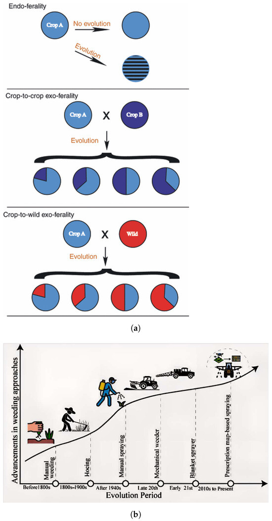 The transition from traditional weeding methods to intelligent automation has been gradual, beginning with basic mechanized solutions and progressing toward advanced, data-driven technologies to accommodate with the mutating weed species which are undergoing a rapid transformation alongside as seen in Figure 5. Initially, mechanical weed control techniques, such as tractor-mounted cultivators, served as alternatives to manual labor. Over time, these systems have evolved to incorporate artificial intelligence (AI), computer vision, and automation, allowing for more precise and efficient weed management [5,12,20,21,22]. There even exist autonomous robotic weeders equipped with mechanical or laser-based removal systems and GPS-integrated IoT solutions [23,24,25,26] for optimized field operations [12,26,27,28]. This evolution reflects a significant shift from generalized mechanical weeding to precision-based approaches that minimize labor dependency while enhancing overall agricultural sustainability [29].