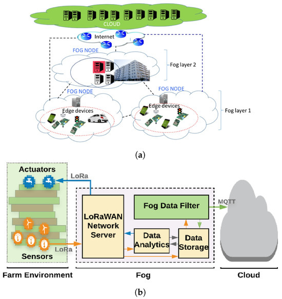 (a) Fog nodes connecting cloud and edge devices [72]. (b) Three-layered architecture for integrated farm management [73].