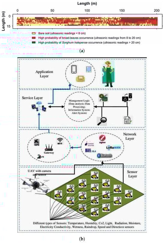 Remote sensing techniques play a crucial role in site-specific weed management by enabling real-time monitoring and automated analysis. High-resolution multispectral, thermal, and radar imagery from satellites like Sentinel-1, Sentinel-2 [25,83], Landsat and Planet Scope, along with UAV-based imaging, support hybrid interpolation for weed detection [83]. These technologies facilitate fully automated weed mapping, reducing the need for manual field inspections [26]. Machine learning-based remote sensing also aids in assessing soil parameters essential for fertilization. The integration of Synthetic Aperture Radar (SAR) and optical satellite missions enhances daily, high-resolution monitoring, making remote sensing an indispensable tool in precision agriculture as seen in Figure 12 [84,85].