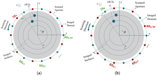 A straightforward approach to implement the electronic scanning scheme is to construct the system with two switching networks—one for the transmitter path and another one for the receiver path—along with additional switch elements of to control the role of each antenna (i.e., transmitter or receiver). However, this configuration is costly, bulky, and complex to implement. To address this, we propose a novel switching scheme involving only two switching networks (labeled as A and B), each of size , assuming is even. The common (COM) ports of these networks are connected to the two ports of a vector network analyzer (VNA) for measurement. The output ports of switching networks A and B are alternately connected to the elements of the antenna array in an interleaved manner, as illustrated in Figure 1. Antennas associated with networks A and B are shown in red and green, respectively. Electronic scanning is performed such that, at each scanning step along , an antenna from one of the networks operates as the transmitter, illuminating the imaged medium, while antennas from the opposite network act as receivers. These receivers are chosen across an angular span of , with the transmitting antenna located at the center of this span but on the opposite side of the imaged domain (see Figure 1 for reference). This selection and measurement process is repeated until each of the antennas has acted as a transmitter once in the specific z position. This procedure ensures scattered field measurements over a full circular aperture. Figure 1a,b show two such sampling steps.