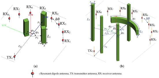 Figure 2a illustrates the FEKO simulation setup for Simulation Example 1, where three linear cuboidal objects are positioned at radii and . Two of them are placed at with angular positions and , while one is aligned at along the x axis. Table 1 summarizes the parameters for this example.