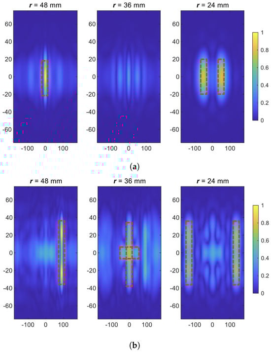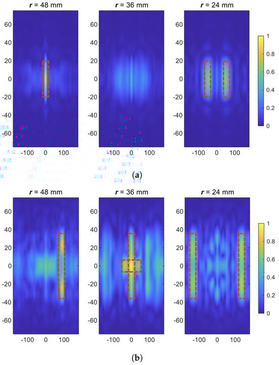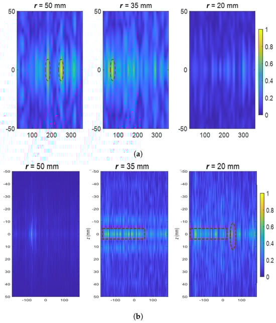 Reconstructed images for (a) Simulation Example 1 and (b) Simulation Example 2 when 201 samples were used along the axis and electronic and mechanical scanning along the azimuthal direction was performed. Red dashed lines outline the target boundaries. Horizontal axis: (deg); vertical axis: z (mm).